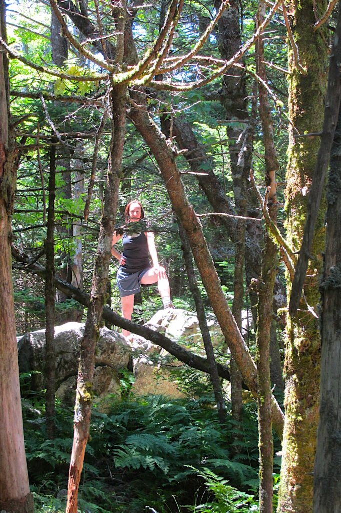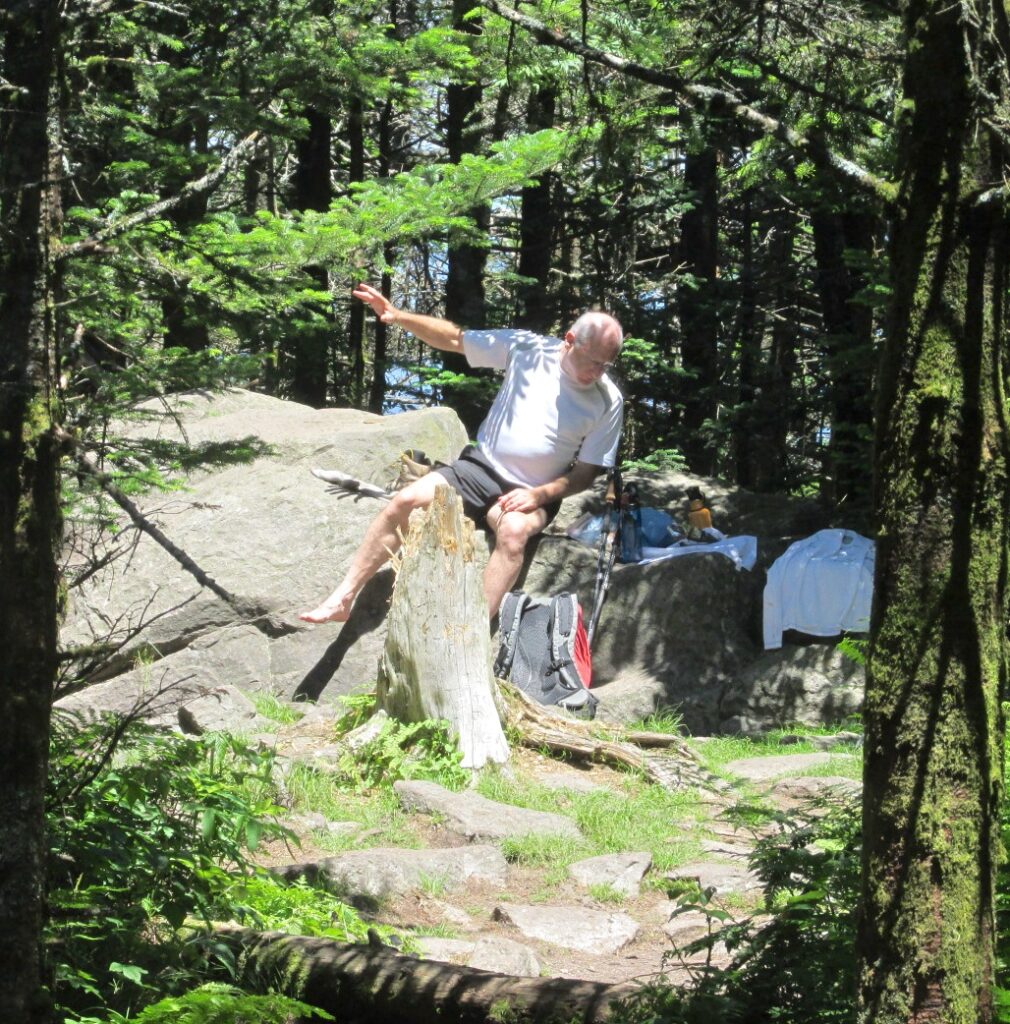 We’re enjoying the summit of Mount Rogers, the high point of Virginia. Which means that after hiking so many hours to gain 1500 feet of elevation, we’re doing nothing in particular, just being here. Lisa does a little exploring of the high woods in our vicinity while I absentmindedly lean on the large, conveniently placed rock, eating part of my sandwich, looking around at the arboreal abundance.