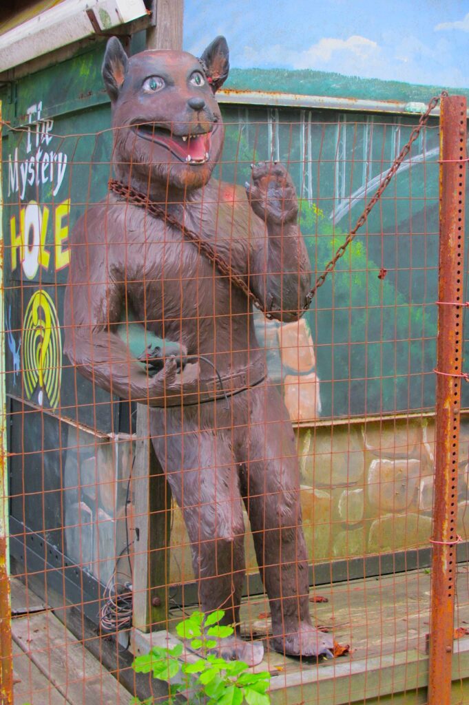 One point six miles up the road from Hawks Nest State Park is Mystery Hole, a place where “The Laws of Gravity [are] defied!” they tell us. “Some [visitors] have gone away so bewildered that they’ve headed in the wrong direction and became lost.”