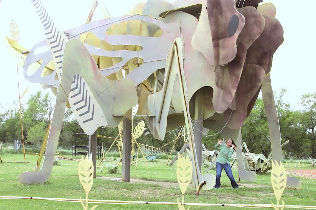 The Enchanted Highway is an otherwise unremarkable 32-mile stretch of two-lane North Dakota highway connecting Gladstone, a city of 239 residents and Regent, with its 172 residents. What keeps the Enchanted Highway from being unremarkable is the assembly of scrap metal sculptures, the world’s largest. Driving from north to south as we do, Geese in Flight is at the junction of the interstate highway and the E H. Soon enough we come to Grasshoppers in the Field, our favorite, and Fisherman’s Dream. Continuing south, stopping at every damned one, is Pheasants on the Prairie, Teddy Rides Again and The Tin Family. Spider Webs is not yet finished.